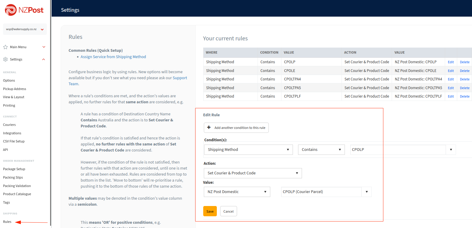 - Login to eShip eship.nzpost.co.nz, and go to Settings then Rules.