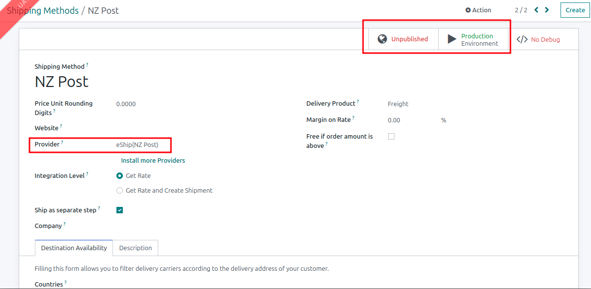 Under Inventory - Configuration - Shipping Methods in Odoo, add an entry for NZ Post, with the Provider set to "eShipNZ (NZ Post)". Set the environment to Production (as mentioned previously this doesn't matter as long as you don't scan the delivery labels), and leave it as Unpublished.
